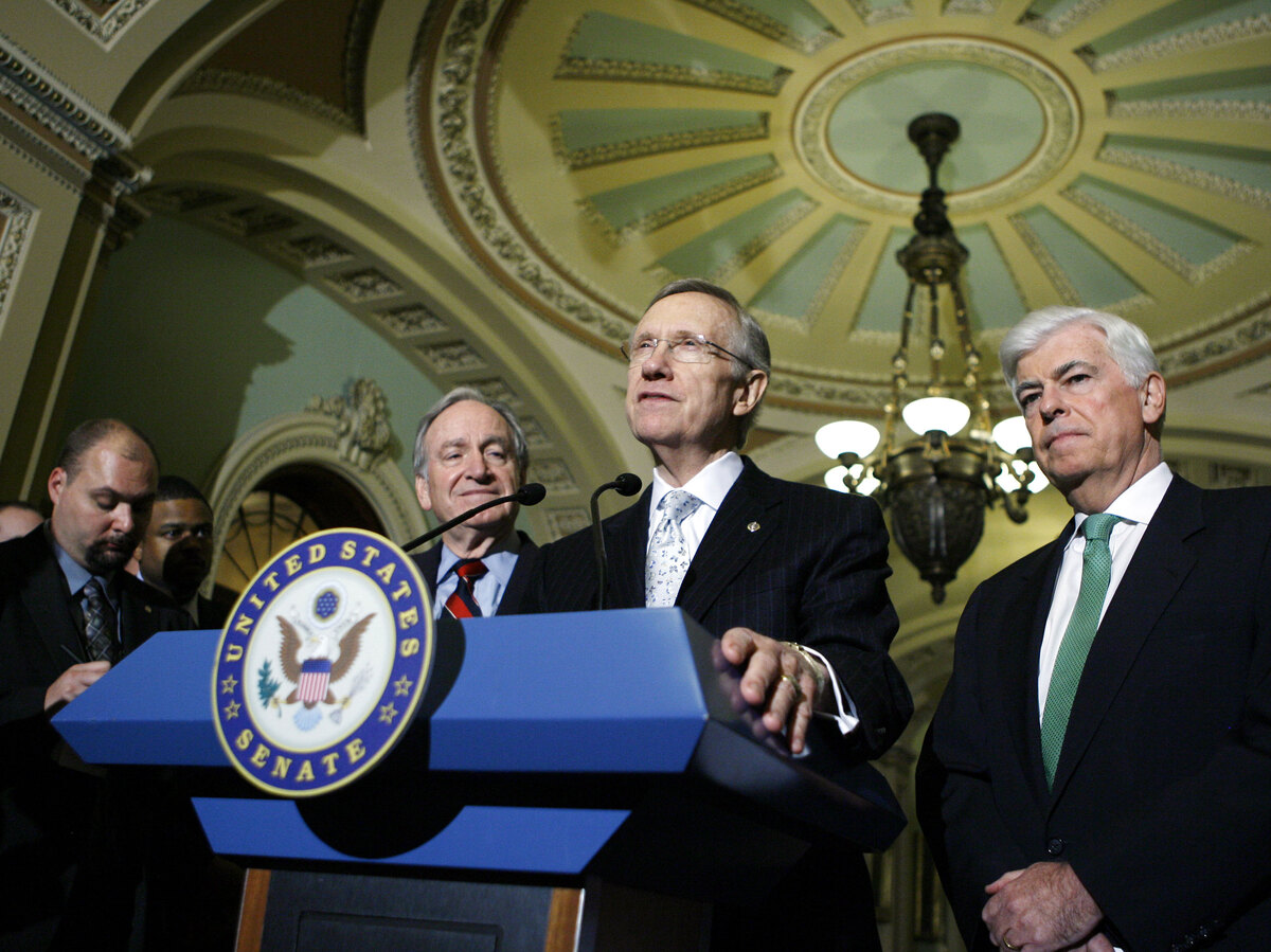 Senate Majority Leader Harry Reid D-Nev., speaks after the U.S. Senate voted to begin debate on legislation for a broad healthcare overhaul at Capitol Hill in Washington on Saturday, Nov. 21, 2009, as Sen. Chris Dodd, D-Conn., right, and Sen. Tom Harkin, D-Iowa looks on. Jose Luis Magana/AP hide caption