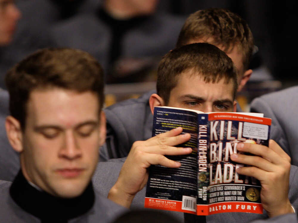 A cadet reads highly topical material while waiting for President Obama to speak on his policy for Afghanistan at the U.S. Military Academy at West Point, N.Y. Julie Jacobson/AP hide caption