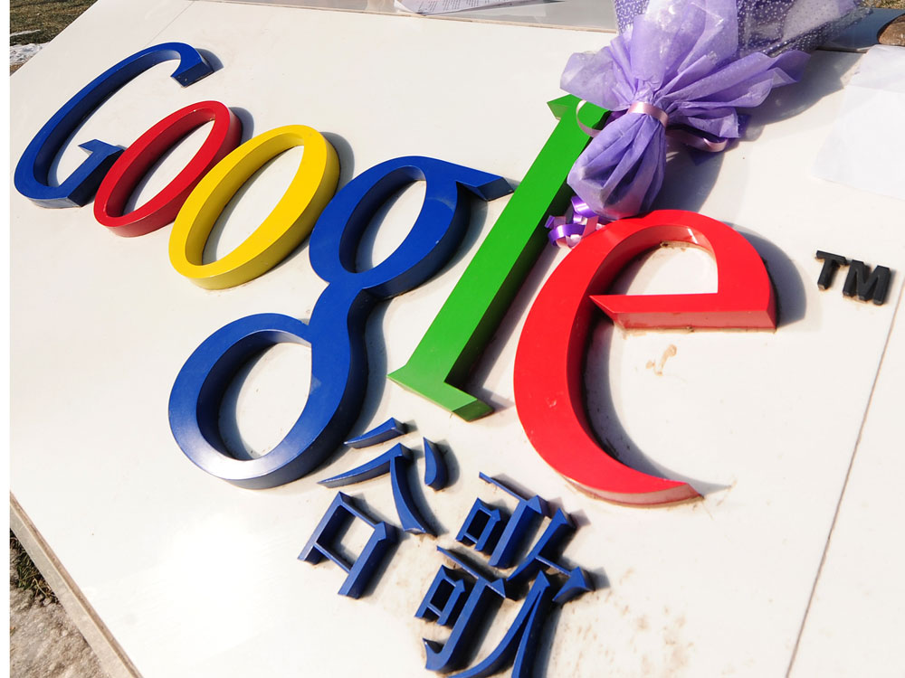 A bouquet of flowers lies upon the Google logo outside the company's Beijing headquarters.