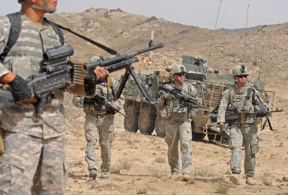 U.S. soldiers on patrol May 8 in Afghanistan's Kandahar province. President Obama's two-pronged plan to combat the Taliban and rebuild the country's infrastructure and civil society is under scrutiny. Tauseef Mustafa/AFP/Getty Images hide caption