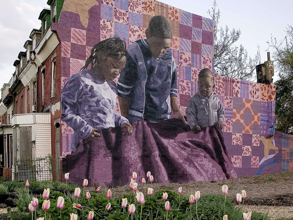 "Holding Grandmother's Quilt" spans two walls in the West Philadelphia neighborhood of Mantua. Click here to see the other wall of the mural, which depicts the grandmother sewing.