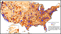High-speed Internet providers by zip code, as of December 2004. Areas in blue have seven or more providers, areas in brown have four to five and areas in tan one to three.