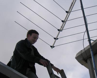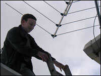 Mike Chapman climbs onto the roof of the Mountaineer Food Bank in Gassaway, W.Va., to test wireless equipment. By attaching a small satellite dish to a TV antenna, he can provide wireless Internet access to the food bank and other businesses nearby.