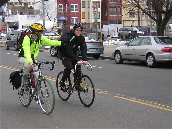 Dan Charles, left, rides with bike messenger Vincent Betette in Washington, D.C.
