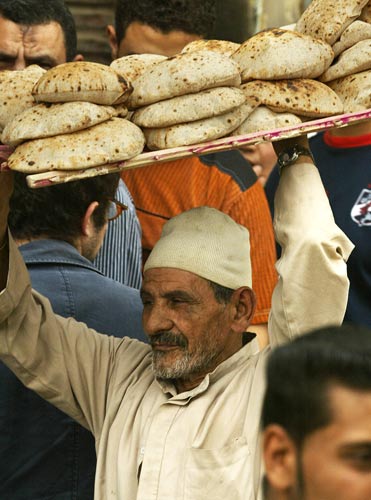 A vendor carries a rack of bread in the Nile Delta city of Mahalla, Egypt, north of Cairo, on April 6, 2008. The country is in the grip of a serious bread crisis brought on by the rising cost of wheat.