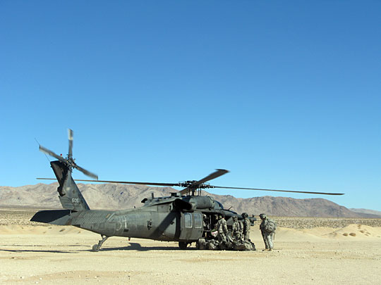 U.S. troops board a helicopter at the base in the Mojave Desert in California.
